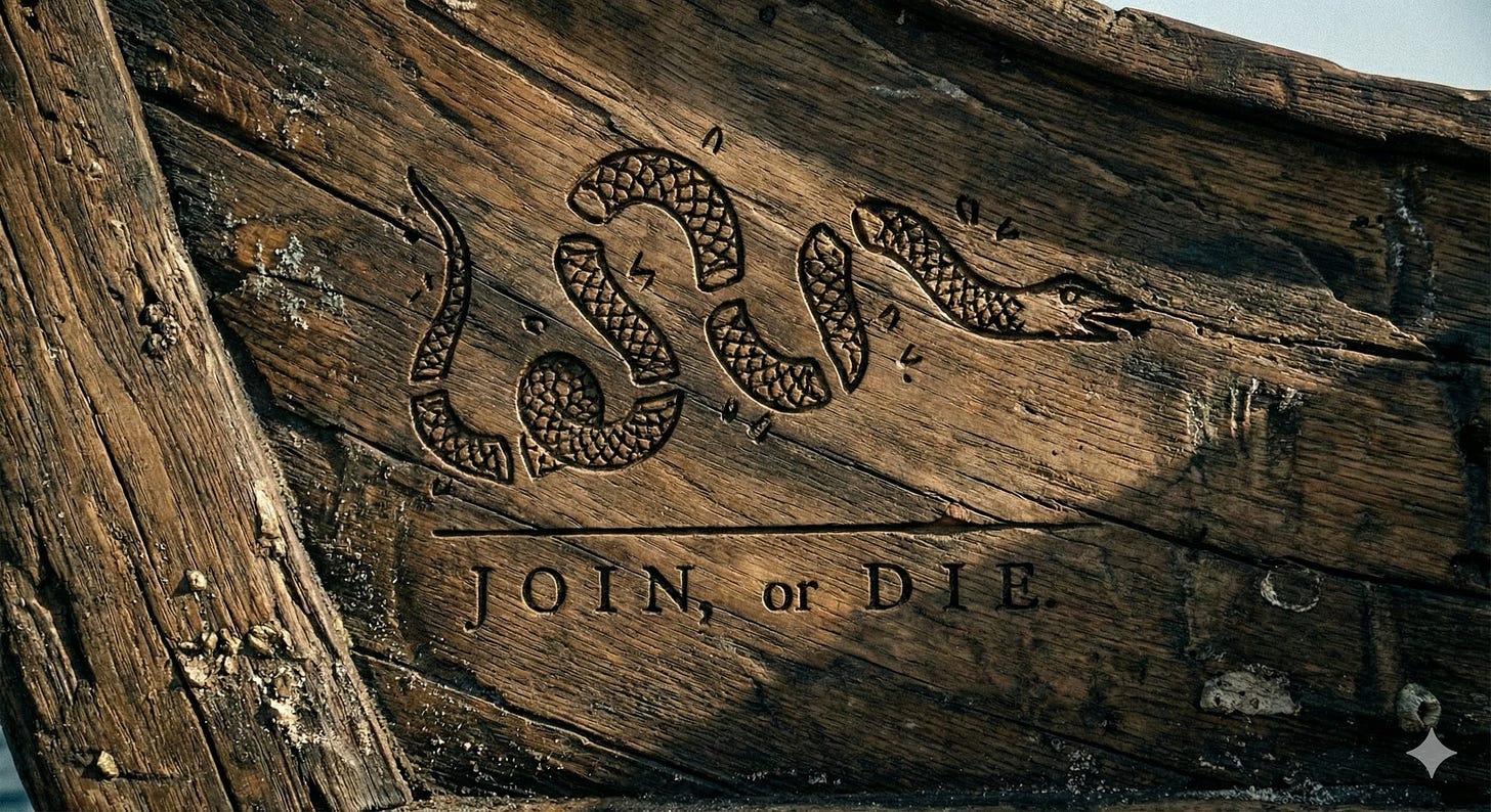 Now I understand it as the neurodivergent imperative: my different cognitive modes must collaborate or I sink. The analytical and the creative, the hyperfocus and the scattered, the parts of me that seem contradictory. They either integrate or fragment into uselessness. Join or die isn’t only about teamwork. It’s about internal coalition too.